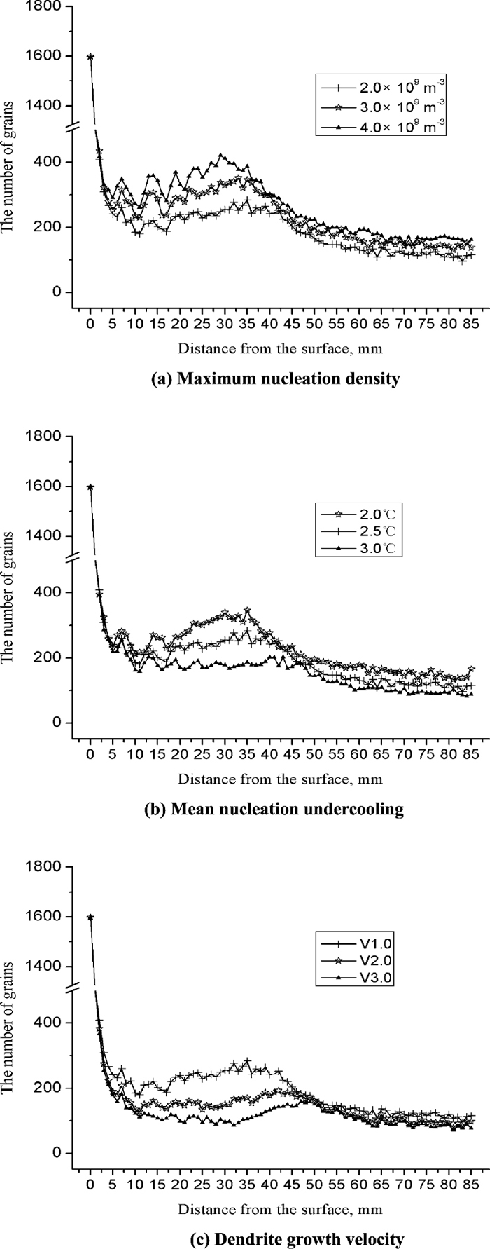 Average grain numbers of longitudinal section of the outer columnar grain zone under different maximum nucleation densities, different mean nucleation undercoolings and dendrite growth velocities.