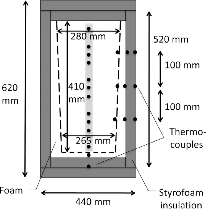 A thermally insulated cylindrical container was used to measure heat transfer between warm and cold pellets (Fig. 1). The container had a diameter significantly larger than the diameter of pellets (typically 10 mm), i.e. between 265 and 280 mm at the bottom and top, respectively. It was surrounded by a rectangular box filled with insulating polyurethane foam. The box was insulated by sheets of 0.05 m-thick insulation at the 4 sides parallel to the axis of the container, and 0.1 m-thick insulation at top and bottom of the container (manufacturer-supplied thermal conductivity of insulating material, Sundolitt XPS300, k = 0.036 W m–1 K–1). The height of the container was 0.41 m, holding approximately 45 kg pellets. Eleven thermocouples were mounted on a vertical pole, protruding 40 mm horizontally from the support pole. The support pole was positioned 40 mm from the center axis, allowing the temperature profile to be measured along the axis of the container. Thermocouples were positioned at the following distance with respect to 0.2 m above the bottom of the container: –175, –125, –100, –75, –25, 0, 25, 75, 100, 125, and 175 mm (Fig. 1). In addition, thermocouples were attached at the outside of the cylinder and inside and outside of the insulation to be able to assess heat loss during the experiment (Fig. 1).