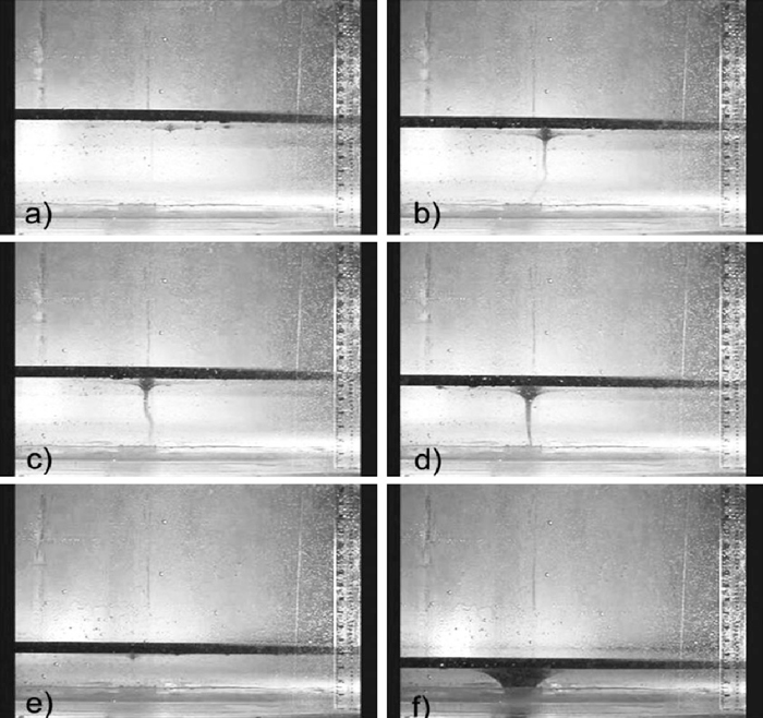Development stages of the vortex funnel development and oil entrainment. a) Surface dimple starts, b) Development of a shallow vortex with weak vibrating tail, c) Development of a deep vortex with tail vibrating strongly, d) Vortex stabilization without a vibrating tail, e) The vortex becomes instable and disappears, f) development of drain sink mechanism.