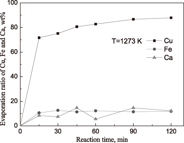 Figure 2 showed the change of evaporation ratio of Cu, Fe and Ca with time at 1273 K for Cu2O–FeO–SiO2–CaCl2 system. It was shown that the evaporation ratios of Cu increased with the reaction time. After 15 minutes, the evaporation ratio of Cu was greater than 70%, and reached up to about 88% with 2 hours. Compared with our previous results, 55.5% at 1273 K and 4 hours for Cu2O–FeO–CaCl2 system,8) the evaporation ratio of Cu was significantly enhanced, and simultaneously the evaporation ratios of Fe and Ca were both kept about 10%.