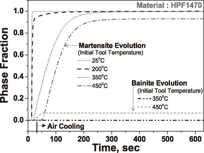 To investigate the cooling characteristics and deformation behavior for the HPF1470 steel under partial quenching in HPF (PQ-HPF), the tool temperature for U-draw bending was controlled by cartridge heaters, as shown in Fig. 1(c). Four different tool temperatures were considered: room temperature (RT), 200°C, 350°C, and 450°C. The measured and simulated temperature histories at the Top part of the U-channel are represented in Fig. 14 as a function of the initial tool temperatures. The temperature histories with TP turned on were in excellent agreement with the measured temperature for all four cases. These histories were superposed to the CCT diagram of HPF1470 in Fig. 15, which indicated that a broad range of hardenability is accessible depending on the initial tool temperature in the U-draw bending test. Note that for these PQ-HPF simulations, the air cooling stage of U-channel is important. The calculated volume fractions of transformed phases are represented in Fig. 16. 100 and 95% austenite decomposition were obtained at the end of die quenching (but before air cooling by removing the tools from quenched sheet) with initial tool temperatures of 25°C and 200°C, respectively, while these fractions dropped to only 15 and 3% after quenching, respectively, with initial tool temperatures of 350 and 450°C. In the latter case, it can be shown that most of the phase transformation took place during air cooling of U-channel (after removing tools from the cooled sheets) at higher initial temperature. The phase fraction evolutions shown in Fig. 16 indicate that almost 100% martensite is achieved when the initial tool temperature is lower than 450°C either by tool quenching only or by tool and subsequent air cooling. The bainitic phase fraction also increased during die quenching and air cooling for the initial tool temperature of 450°C.