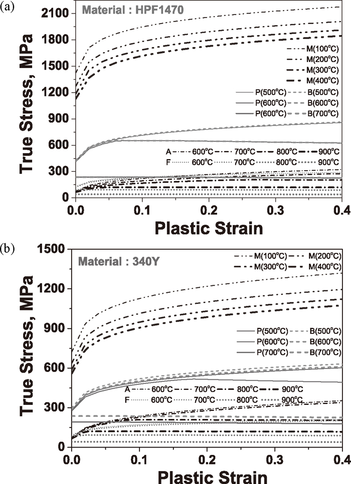 Flow stress curves of constituent phases of (a) HPF1470 and (b) 340Y for various temperatures at the strain rate of 0.1 s–1.