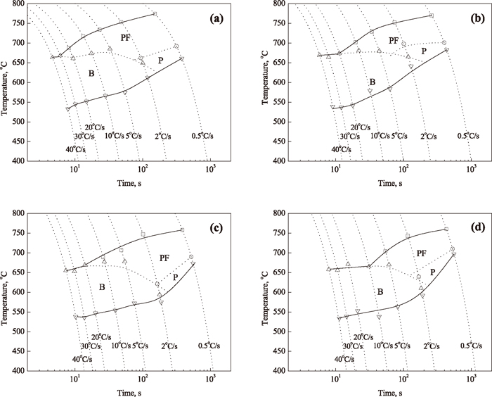 (1) The polygonal ferrite transformation field is shifted to the right and moved down as the deformation temperature is increased. The time of transformation is firstly sharply decreased and then slightly decreased with the increase of cooling rate for four different deformation temperatures; furthermore, the progress of transformation for the lowest continuous cooling rate of 0.5°C/s was obviously retarded at lower deformation temperature, but this effect is not pronounced at the range of cooling rate higher than 2°C/s.