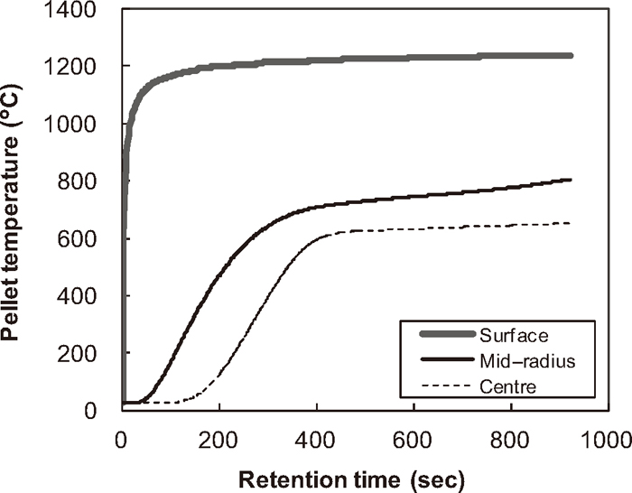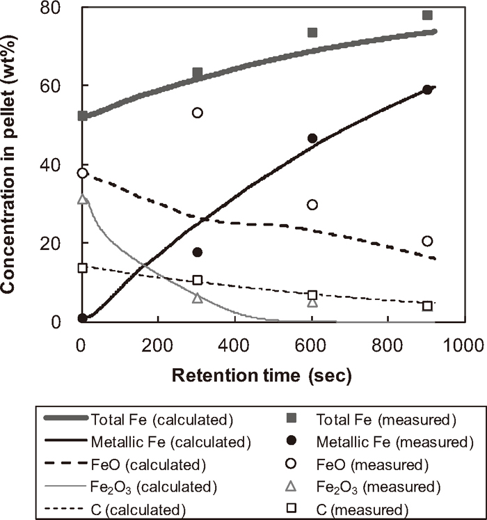 Figure 2 shows the calculated temperature trend at different positions of the pellet for Run 1. The temperature at surface reaches over 1100°C in 100 seconds while the centre temperature remains around 500°C until the end of simulation. Figure 2 clearly illustrates that the substantial temperature gradient in a pellet continues to exist throughout the reduction period. Figure 3 shows the calculated and measured concentration of total Fe, metallic Fe, FeO, Fe2O3 and residual carbon in the pellet for Run 1. Figure 3 demonstrates the pellet reduction process where the iron oxides are reduced into metallic iron consuming carbon as a reductant. The discrepancies between measured and simulated concentrations are seen at 300 seconds for all constituents. Although the reason for these differences should be further investigated, these discrepancies might be attributed to the experimental and measurement procedural matter since such a sudden concentration jump is not considered as realistic.