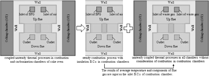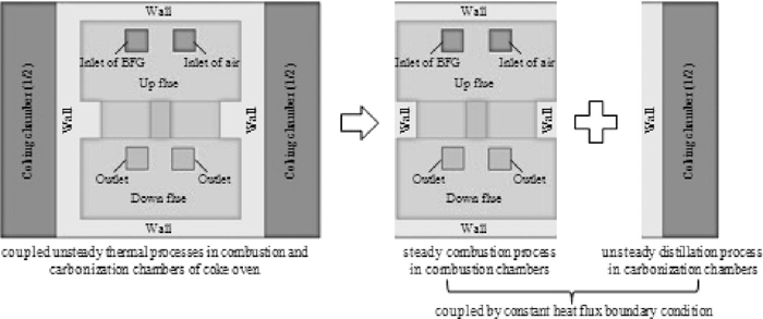 In the first decoupling numerical method, the coupled transport phenomena in combustion and carbonation chambers of coke oven were separated into two parallel processes: steady heat transfer with combustion and fluid flow in combustion chamber, and unsteady heat conduction in coking chamber. For either chamber, necessary gas-side boundary condition (B.C.) on the inter-wall was approximated as constant heat flux. The value of heat flux was obtained by heat balance calculation, based on plant measurements. In fact, this decoupling makes the simulation in coking chamber and the simulation in combustion chamber independent on each other. So, we call it ‘parallel decoupling method’, as shown in Fig. 2.