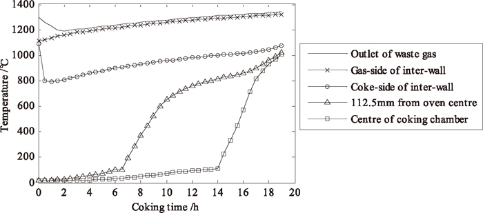 Figure 7 shows the evolution of coke bed average temperature in coking chamber and waste gas average temperature at outlets in combustion chamber. The central temperature of coke bed achieves 1020°C at the 19th hours. At the same time, the gas-side temperature of inter-wall in the combustion chamber is 1241°C (measured value is about 1250°C), while the average temperature of waste gas at flue outlets is 1280°C (measured value is about 1300°C). The second decoupling method was also proven to be less time-consuming (about 30% of coupling calculation time) and effective in prediction.