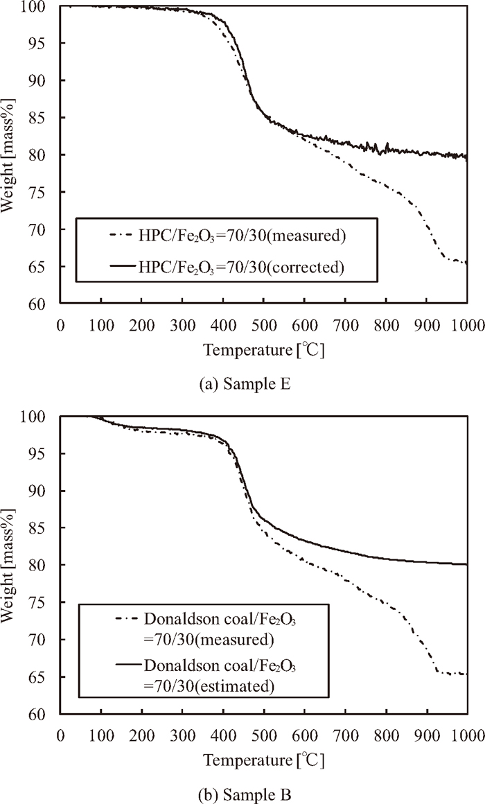 Thermogravimetric analyses (TGA) were performed using a TG/DTA 220 (Seiko Instruments Inc.). Samples A, B, D, E, and G were compressed at the same condition as described in section 2.1. Approximately 1 mg tablets were heated from room temperature to 1000°C at 5°C/min under a nitrogen flow of 50 ml/min. To evaluate the weight loss of HPC or Donaldson coal, which is affected by the reduction reaction, the weight loss of HPC or Donaldson coal with iron oxide addition, ΔWMeasured [mass%] is defined the measured values of samples B and E respectively. Furthermore, it is assumed the corrected relative weight loss of HPC or Donaldson coal, and iron oxide, ΔWCorrected [mass%], which is not affected by the reduction reaction, and is therefore calculated using the measured values of samples A, D, and G, as follows: