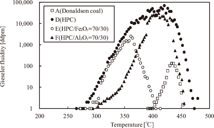 Uchida et al.12) reported that although the strength of ferro-coke decreased because the iron particles inhibited coal particles adhesion, the strength of ferro-coke with added HPC increased because the coal particle adhesion was improved. Kannari et al.13) reported that the fluidity of coking coal with added Fe2O3 decreased, because the toluene-insoluble and pyridine-soluble fractions of the coking coal were decomposed by the Fe2O3. Barking et al.14) also suggested that the thermoplastic properties of coal decreased owing to the oxygen included in the iron oxide. For these reasons, it is necessary to establish the guidelines for the preparation of HPC with thermoplastic properties that are ideal for improving the strength of ferro-coke when it is utilized as an additive and to quantitatively determine the cause of changing in the thermoplastic properties of HPC with iron oxide addition.