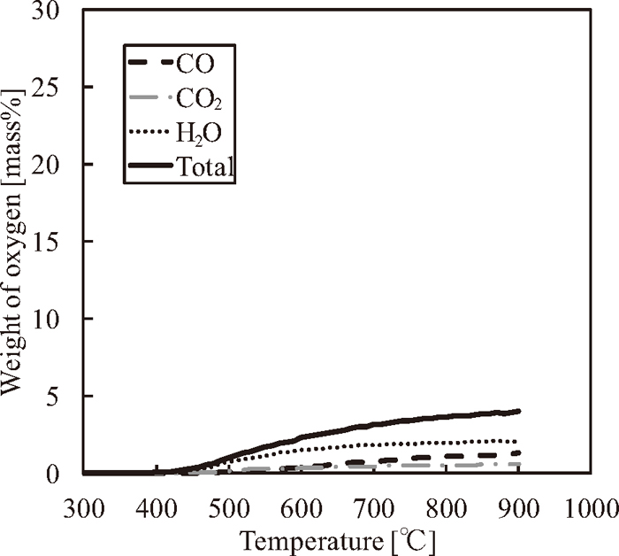 Figure 9 shows the behaviors of the reduction ratios calculated from the titration and the gas analysis over the range from 300 to 500°C. The reduction ratio from the titration included the weight of oxygen generated from the iron oxide because of the reduction reaction. On the other hand, the reduction ratio from the gas analysis is calculated from the low-molecular weight gases and H2O, and it does not include the weight of oxygen from the iron oxide that remained in the thermoplastic components of the HPC. In general, the oxygen ratio for low-rank coal is higher than that of caking coal, and the fluidity of low-rank coal is lower than that of caking coal.16) In the present study, therefore, the fluidity can be decreased by the oxygen from the iron oxide in the thermoplastic components of the HPC. Hence, the weight of the oxygen from the iron oxide in the thermoplastic components of the HPC is investigated. The difference between