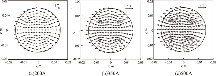 Distribution of magnetic flux density on cross section of z=0 with different coil current intensities (conventional nozzle, frequency 50 Hz).