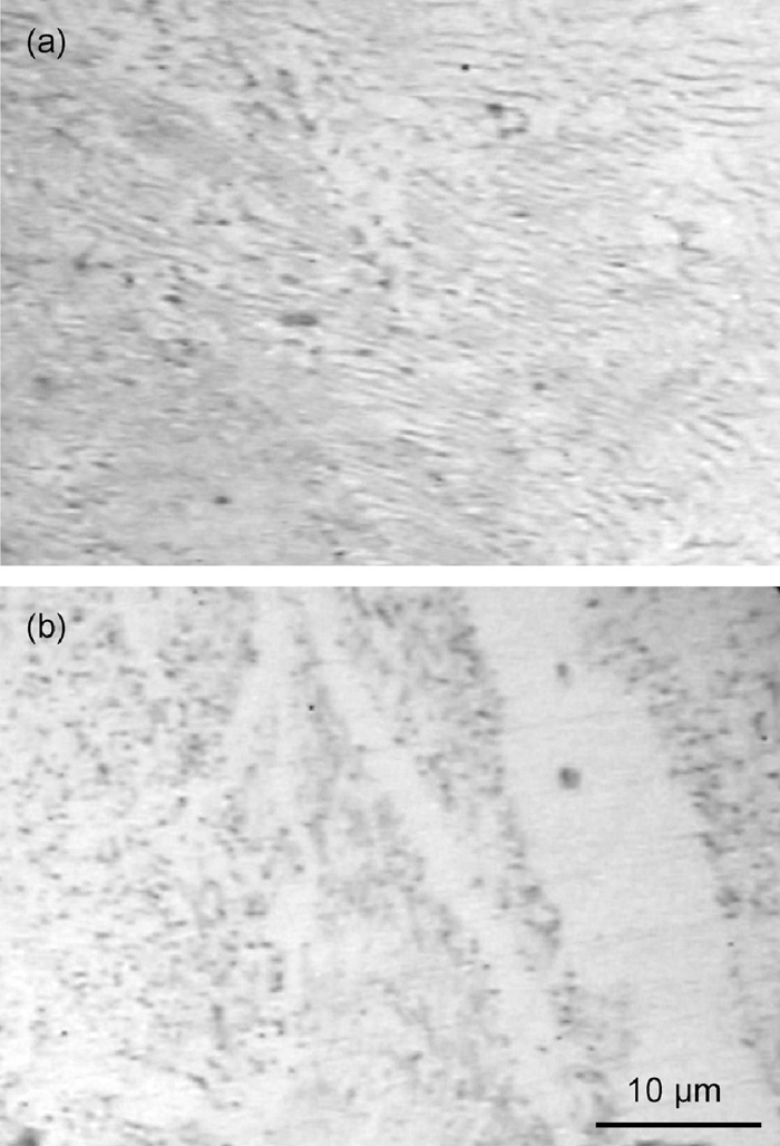 Figure 5 shows the microstructures of the original material and the chip specimen of 0.83%C steel. Pearlite structure with lamellar cementite phase is observed in the original material (Fig. 5(a)). However, pearlite structure is not clear in the chip specimen with γ ≈ 7.5 (Fig. 5(b)). The length direction of chip specimen is horizontal in this figure. Small granular precipitates together with precipitate-free zones running in the vertical direction are visible in the chip specimen. Lamellar cementite phase becomes an obstacle to impede the movement and rearrangement of dislocations which are introduced by machining. At the same time, a part of cementite lamellar phase may be cut by dislocations to form segments or granular particles, or may dissolve into ferrite matrix during heating in the cutting process. These processes may lead to slightly larger grain size (~0.7 μm) in the chip specimen of 0.83%C steel compared to that (~0.5 μm) in the chip specimen of pure iron (Fig. 2) at the same shear strain of ~7.5.