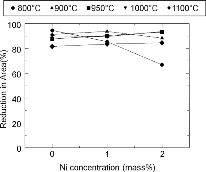 Hot ductility is evaluated from the reduction in area, which represents change of cross-sectional area of the rod shape specimen before and after tensile rupture test in the temperature range from 800 to 1100°C at a strain rate of 5 × 10–3 s–1. Reduction in area (unit: %) is defined as 100×(S0–S1)/S0, where S0 and S1 represents cross-sectional area before and after tensile test, respectively. Before the tensile tests, specimens were annealed at 1350°C for 10 minutes in order to align grain size of each specimen and after annealing, specimens were cooled with the rate of 200°C/s to the temperature at which tensile rupture tests were conducted. Annealing and tensile tests were conducted in nitrogen atmosphere to prevent the effect of surface oxidation on the mechanical properties.