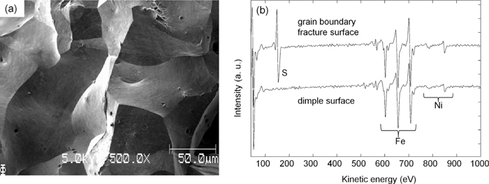 (a) Secondary electron image and (b) AES spectra from fracture surfaces in Fe–10%Ni–20 ppm S alloy.