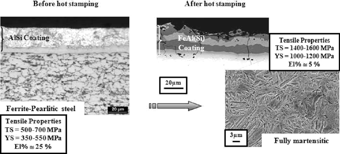 Microstructures, coating and mechanical properties before and after hot stamping operations (Heating conditions: 880 to 930°C, during 3 to 10 min – die quenching).20)