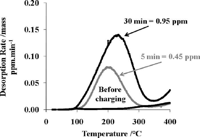 The TDA set-up consists of a heating room in which a flat sample is heated in an I-R furnace at 20°C/min under a constant flow of pure nitrogen up to 900°C. The temperature is recorded by a thermocouple spot welded on the sample surface. Released hydrogen carried by nitrogen is detected by a quadrupole mass spectrometer. The typical sample dimensions are 25 mm in width and 80 mm in length. Filters are included before analysers in order to avoid any spectrometer contamination due to the coating. In the present study, the calibration is performed by a certified gas mixture of 50 ppm hydrogen in nitrogen having a standard deviation of 0.7 ppm. In order to avoid the hydrogen desorption, the samples are stored in liquid nitrogen until the measurement is conducted on them. After removal from cryotank, the samples are cleaned in acetone and dried. Desorption curves are analyzed and the rate of desorption is expressed in mass ppm/min as a function of the temperature expressed in °C. The diffusible hydrogen content is quantified during heating by integrating the signal from the room temperature to 360°C when the test is performed at a heating rate of 20°C/min. In the case of slower heating rate, such as at 1.66°C/min, the integration of the signal is stopped at 250°C. As shown in Fig. 3, the integration gives similar amount of diffusible hydrogen for both the heating rates.