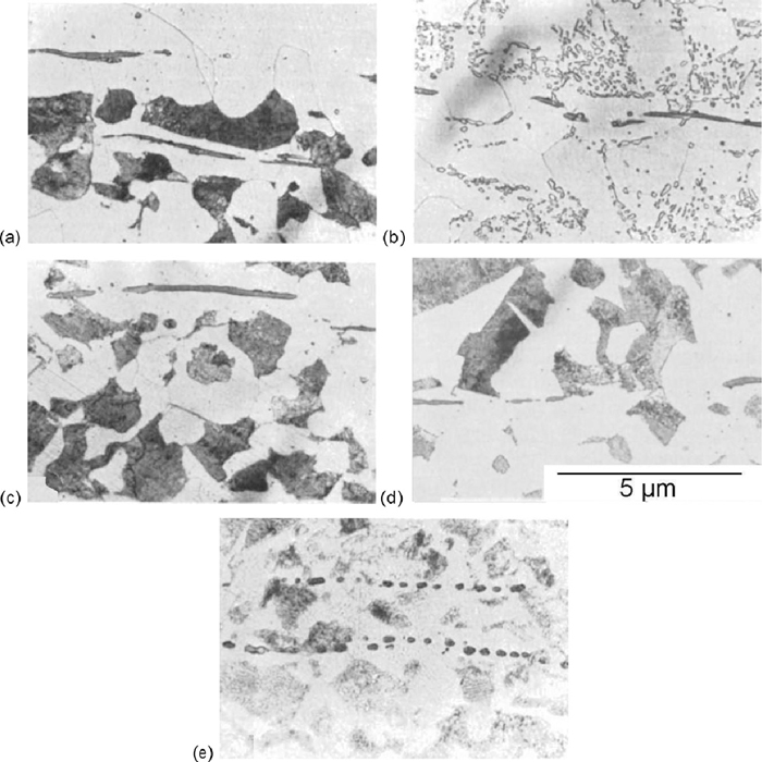 Fe–0.36C–0.22Si–0.73Mn–0.02P–0.025S wt%. (a) As–received hot–rolled condition. (b) Following spheroidisation heat–treatment involving dwell and cycling between 750 and 690°C followed by furnace cooling. (c) Austenitisation at 950°C for 1 h followed by air cooling. (d) Homogenisation at 1300°C for 1 h followed by furnace cooling. (e) Homogenisation at 1300°C for 4 h followed by furnace cooling. Reproduced from Ref. 40) with permission from Elsevier.