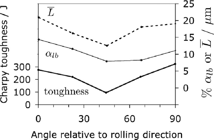 The Charpy toughness at –60°C, percentage of lower bainite (αlb) and mean lineal intercept as a function of the angle in degrees, relative to the rolling direction. Adapted from Ref. 54).