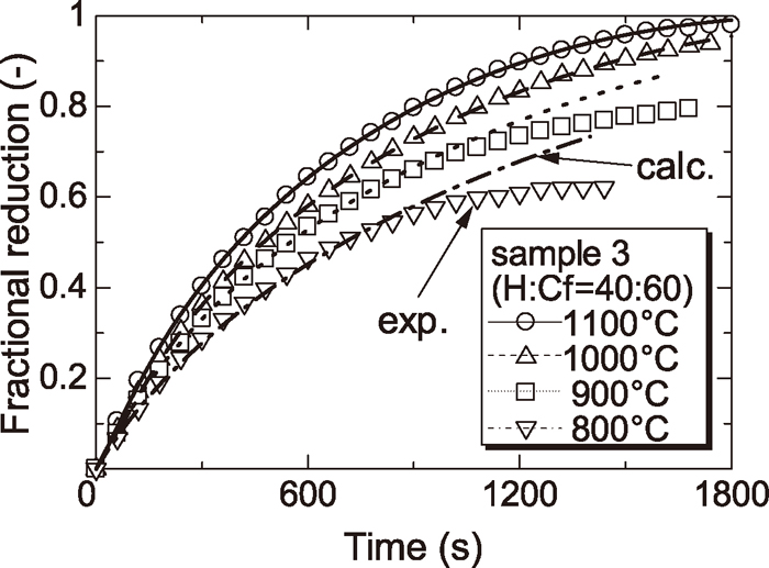 4.2. Results of AnalysisFigures 1, 2 and 3 show the calculated reduction curves and observed data for comparison. Calculated reduction curves agreed with observed data very well above 1000°C. By contrast, calculated reduction curves in later reduction step of reduction did not agree with observed data below 900°C. This is attributed that the reduction reaction did not proceed topochemically and was retarded by dense iron layer reduced from H particle.