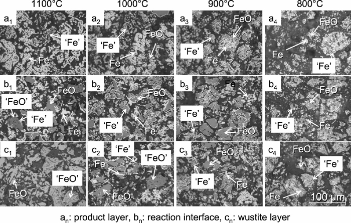 Figure 9 shows the microstructure of partially reduced sample 1 at 800, 900, 1000 and 1100°C. In this figure, an, bn and cn show the microstructure at surface layer, at the reaction interface and at the center of sample respectively. In this figure, FeO and Fe show wustite and iron derived from H respectively, and ‘FeO’ and ‘Fe’ are wustite and iron derived from Cf respectively. Additionally, Fig. 10 shows particles reduced at 900°C derived from H and Cf respectively.