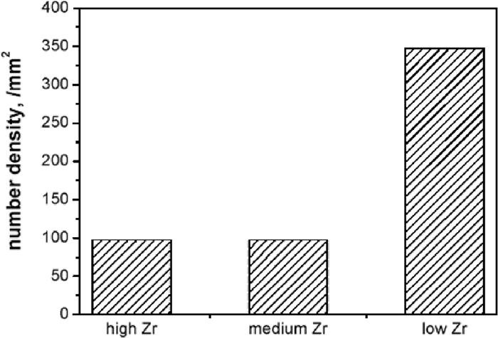 Number density of inclusions in high Zr, medium Zr, and low Zr steel samples.