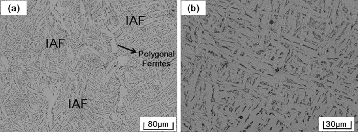 Optical microstructures of the steel samples are presented in Figs. 2, 3 and 4. It can be seen that microstructures of the three steel samples mainly consisted of ferrites. However, the morphology of the formed ferrites in three samples is distinctive according to the level of Zr contents. In the high Zr sample, ferrites are in chaotically polygonal shapes, with sizes usually more than 200–300 μm, as shown in Fig. 2. In the medium Zr sample, very fine acicular ferrites were found to hvae developed; these are called inters. Some polygonal shaped ferrites are also observed, as shown in Fig. 3(a). Images of higher magnification indicate that these acicular ferrites appeared as interwoven long strips, as shown in Fig. 3(b). In the low Zr sample, interlocked lenticular shaped ferrites formed with prior austenite grains are the main feature of the microstructure. Sheaf morphology side plate ferrites and polygonal allotrimorphic ferrites nucleated and developed from the prior austenite grain boundaries are also formed in this sample, but they are only a small fraction, as shown in Fig. 4(a). These lenticular shaped ferrites have different growth orientations and, with two dimensional size of mainly less than 50 μm, resulted in an intersecting image under optical microscope observation, as shown in Fig. 4(b) at larger magnification.