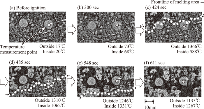 Figure 11 shows X-ray CT images around the T1 pellet embedded in the sintering bed and the temperatures inside and outside the pellet. The white areas in the X-ray CT images corresponded solid materials, and the black areas corresponded pores. According to the method in a previous report,11) the melting region was identified from the difference in 2 CT images taking within a short time. The broken lines in the figures were supposed as the frontline of the melting region, in the following, this line is called as melting front. As shown in Fig. 11, the temperature outside the pellet was maintained at around 60°C after ignition due to the formation of a moisture condensation zone in the raw mixture (Fig. 11(b)). As the melting front approached, the temperature outside the pellet increased (Fig. 11(c)). Thereafter, the outside temperature became the maximum as the melting front passing the pellet.