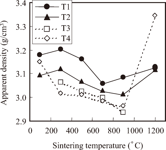 Figure 7 shows the temperature dependence on the apparent density of the burned pellets. The decrease in apparent density was attributable to volatilize of combined water when the temperature was increased from 300°C to 500°C. When the temperature was increased from 500°C to 900°C, the decrease in apparent density was estimated to be due to the progress of the coke breeze combustion. Above 900°C, apparent density increased with increasing temperature because the pore volume might be decreased accompanying the progress of sintering. The apparent density of the T1 pellet containing 12 vol% coke breeze in the nucleus pellet and burned at 900°C was 3.08 g/cm3 and 3.13 g/cm3 at 1200°C. In contrast, with the T4 pellet without coke breeze in the nucleus pellet, the respective values were 2.96 g/cm3 and 3.34 g/cm3. These results suggested that the progress of sintering had been accelerated in the T4 pellet.