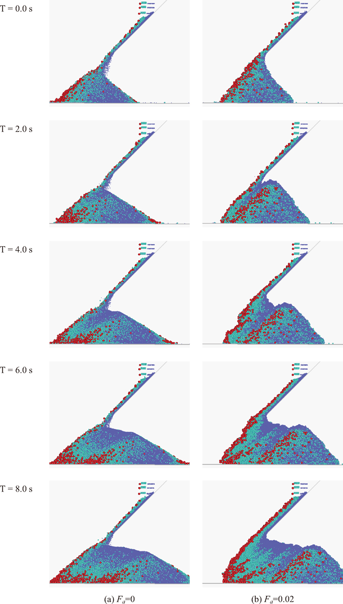 The collapse phenomenon was observed under the condition with uniform granules when adhesion force was introduced. The adhesion force was introduced into granules having size distribution, and the relation between the collapse phenomena and the size segregation phenomena are investigated. The pallet speed is 25 mm/s and the supply speed of granules is 80 ton/h, aiming at 600 mm in the sinter bed height. Figure 8 shows the granules behavior at the charging point from the chute (Fa = 0, 0.02). The colors of granules indicate the granule diameter: red means the largest granules and their diameters is 30 mm, light blue means middle size and their diameter is 15 mm, and blue means the smallest granules and their diameter is 7.5 mm. In case of Fa = 0, collapse phenomena cannot be seen. While, in the case of Fa = 0.02, the slip line is obviously observed. It is confirmed that the adhesion force cause the collapse phenomena even if granules have size distribution. Figure 9(a) shows snapshots of charging behavior in each adhesion force (Fa = 0, 0.01, 0.02, 0.03) and Fig. 9(b) shows the weight ratio of each granules size in the vertical direction. Figure 10 shows the sampling position for evaluating the size segregation in the vertical direction. The width of sampling box is 750 mm, which is almost same as the length of one period of the collapse of the packed bed at Fa = 0.03. Simulation conditions are the same as shown in Table 1. The value of the adhesion force was determined based on the largest granules of 30 mm. When the adhesion force is 0.01, the collapse phenomena cannot be seen clearly. On the other hand, in the case of 0.02 and 0.03 in adhesion force, the collapse phenomena and slip lines are obviously observed. While, from the size distribution in the vertical direction as shown in Fig. 9(b) most of the largest granules exist in the bottom of the sinter bed when the adhesion force is 0. The largest granules spread to the top of the sinter bed when the adhesion force was introduced into the granules. The degree of the size segregation in the vertical direction decreases with an increase in the adhesion force of granules. The reason why the degree of the size segregation decreases in the vertical direction would be that the largest size granules exist along the slip line. The collapse phenomena of the sinter bed would impede the size segregation in the vertical direction of sinter bed. Figure 11 shows the dynamic angle of repose as a function of time with a parameter of adhesion force. When Fa = 0, the dynamic angle of repose is almost constant. On the other hand, when the adhesion force is introduced, the dynamic angle of repose fluctuates periodically and overall increases with an increase in the adhesion force. The period of the dynamic angle of repose changing reduces with an increase in the adhesion force.