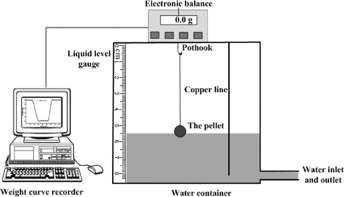 Pellets were used for isothermal roasting process, two kinds of mixed powders (CaCO3+Fe2O3, Ca(OH)2+Fe2O3) were pelletized at pressure of 15 MPa to a pellet shape cylinder with a diameter of 30 mm and a maximum thickness of 15 mm in 20 g weight for each. As water was added during the pelletizing process, the pellets were then baked for 3 h at 120°C before the roasting process. Different roasting temperatures and time were chosen to understand the reaction progress, the experimental scheme is shown as Table 2. A resistance furnace was used for the experiments, the furnace was heated to the desired temperature in advance and then the pellets were put in and placed on some pieces of MgO crucible (99% purity). It took about 30–90 s for the furnace temperature to rise back, and then the timekeeping schedule followed. Both green pellets and roasted samples were measured with a designed apparatus to determine their densities by using the Archimedes method, the experimental apparatus is shown in Fig. 2. In particular, the density of green pellets was measured for three times by using three pellets to get the average value. Paraffin was used to protect the pellet from water during the test, the solid paraffin was first melted to liquid in a beaker and then cooled down in air, the pellet tied with copper line was then immersed into the liquid paraffin quickly when it began of frozen. The pellet wrapped with solid paraffin was then hanged to the electronic balance. The water flowed in slowly until the pellet was completely covered, and ran off later after the data of balance got stable. Thus, a mass curve was measured by the computer connecting to the electronic balance. The volume of the copper line (a diameter of 0.17 mm) immersed in water was neglected in this research.