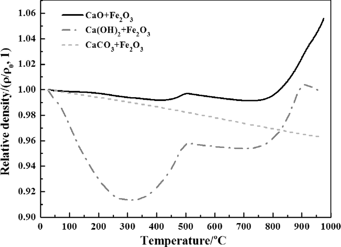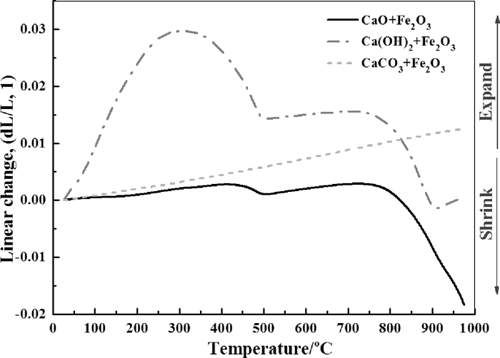 2.2. Experimental ProcedureAll the tests and experiments reported in this study were carried out in air. The relative linear shrinkage rate of mixed samples during the formation process of calcium ferrites in solid-state were determined with thermal expansion tests. Mixed powders (CaO+Fe2O3, CaCO3+Fe2O3, Ca(OH)2+ Fe2O3) were pressed into columns with a diameter of 6 mm and a length of 21–25 mm in a stainless module under a pressure of 3 MPa. The columns were then determined with the thermal dilatometer (NETZSCH DIL 402C) at a heating rate of 10°C/min from room temperature to 980°C.