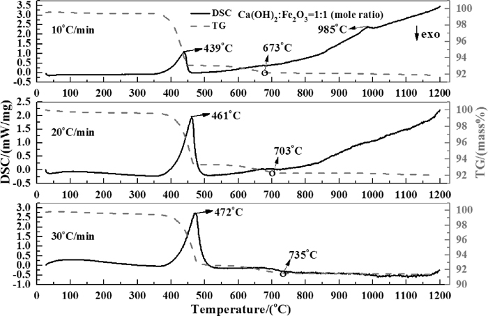 TG-DSC curves of the mixed powders with Ca(OH)2 at different heating rates. Note: the mark “o” on the TG curves was used to represent the finish point of decomposition process.