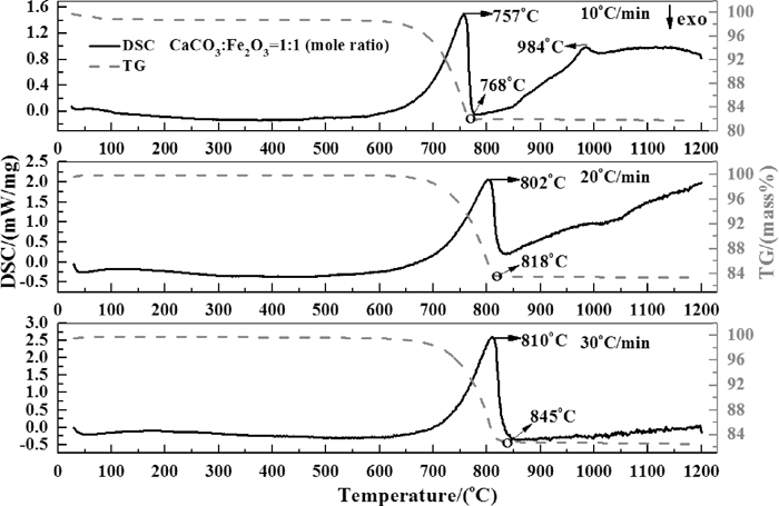 TG-DSC curves of the mixed powders with CaCO3 at different heating rates. Note: the mark “o” on the TG curves was used to represent the finish point of decomposition process.