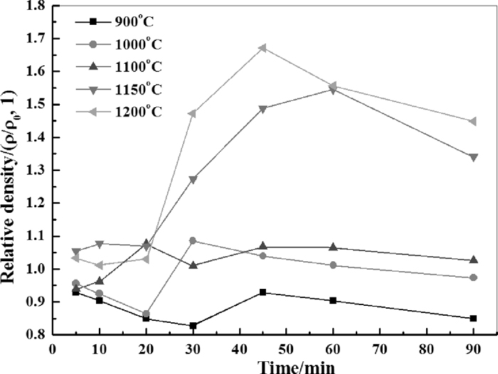 Figure 14 shows the change of relative density with the variation of roasting time and temperature. It can be seen that the influence of decomposition on the density change of samples were in dominate at 900°C. When roasting temperature increased to 1000°C, the decomposition process was accelerated and the density began to rebound later than 30 minutes. At higher temperature (≥1100°C), obvious increase of relative density was seen after 20 minutes’ roasting, then the density get stable 10 more minutes later. The XRD patterns of final samples after 90 minutes roasting at various temperatures are shown in Fig. 15. It could be seen that the peaks of C2F and Fe2O3 became nearly unobservable when the roasting temperature were beyond 1100°C (see the peak of Fe2O3 at 2θ≈24°). Figure 16 shows the XRD patterns of samples roasted at 1200°C for different time. The peaks of C2F and Fe2O3 were very weak, which implies that both the decomposition and calcium ferrites formation reactions were almost completed during the initial 5 minutes although it should be noticed that the timekeeping began after the furnace temperature rise back.