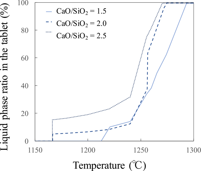 In order to focus on effect of phase transformation on the shrinkage speed, liquid phase formation behaviors in the sample tablets were estimated with thermodynamic equilibrium calculation software, FactSage with FToxid Database, using chemical compositions of the pre-reduced sample tablets from Table 2. Liquid phase ratio in Figs. 5 and 6 were defined with Eq. (2) under following assumptions; metallic Fe phase didn’t melt; any iron oxide didn’t reduce and held as mineral phase. From these figures, higher basicity case obviously shows larger liquid phase ratio at same temperature.