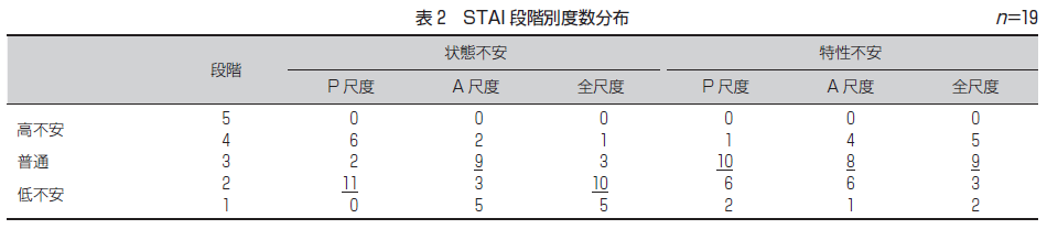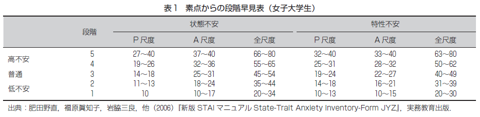 f.STAI新版STAI(State-Trait Anxiety Inventory-Form JYZ)状態不安尺度20項目,特性不安尺度20項目の合計40項目からなり,「1.全くあてはまらない」(1点)から「4.非常によくあてはまる」(4点)までの4段階評価法である.状態不安尺度では不安を喚起する事象に対する一過性の反応を評価し,特性不安尺度では不安体験に対する比較的安定した反応を評価するものである.それらの尺度はさらに不安存在尺度(anxiety-present scale:P尺度;緊張している,ストレスを感じているなど)と不安不在尺度(anxiety-absent scale:A尺度;おだやかな気持ちだ,安心しているなど)の2つのカテゴリーに分けられる.各項目の素点(表1)は5段階に区分され,段階5,4は高不安,段階3は普通,段階2,1は低不安とされる.