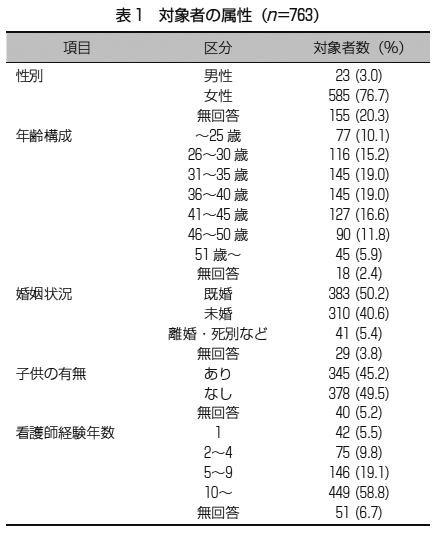 1.対象者の属性回答者の属性について,5項目の単純集計結果を示す(表1).看護師経験年数について,10年目以上が449人(58.8%)と半数以上を占めた.
