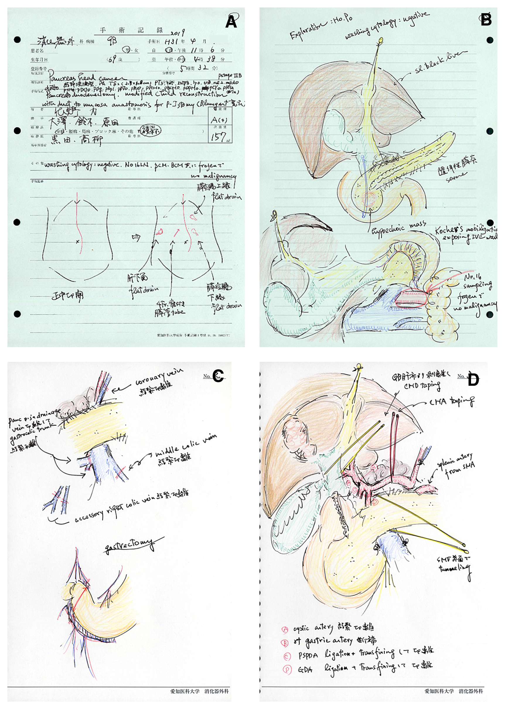 著者が外科研修医時代,上級指導医は自らシェーマを用いて手術記事を難なく書いていた.所属した名古屋大学第一外科(現腫瘍外科)では,教授であっても執刀医が自ら絵で手術記事を書くのが伝統であった.肝胆膵領域腫瘍に対する手術では教授のチェックをパスしなければ手術記事として認められなかった.一方,国立がんセンター(現国立がん研究センター)では外科レジデントが,執刀・前立にかかわらず,手術を勉強するという観点から手術記事を書いていた.前立の側にいながら,どうやって術者側から見た分かりやすいシェーマを書くのかに直面したが,その分手術のことを常に考えており,その後の手術記事作成に役立ったことは間違いない.著者は名古屋大学時代,愛知県がんセンター着任後は現在でも自ら絵で手術記事を書くことを遵守している.