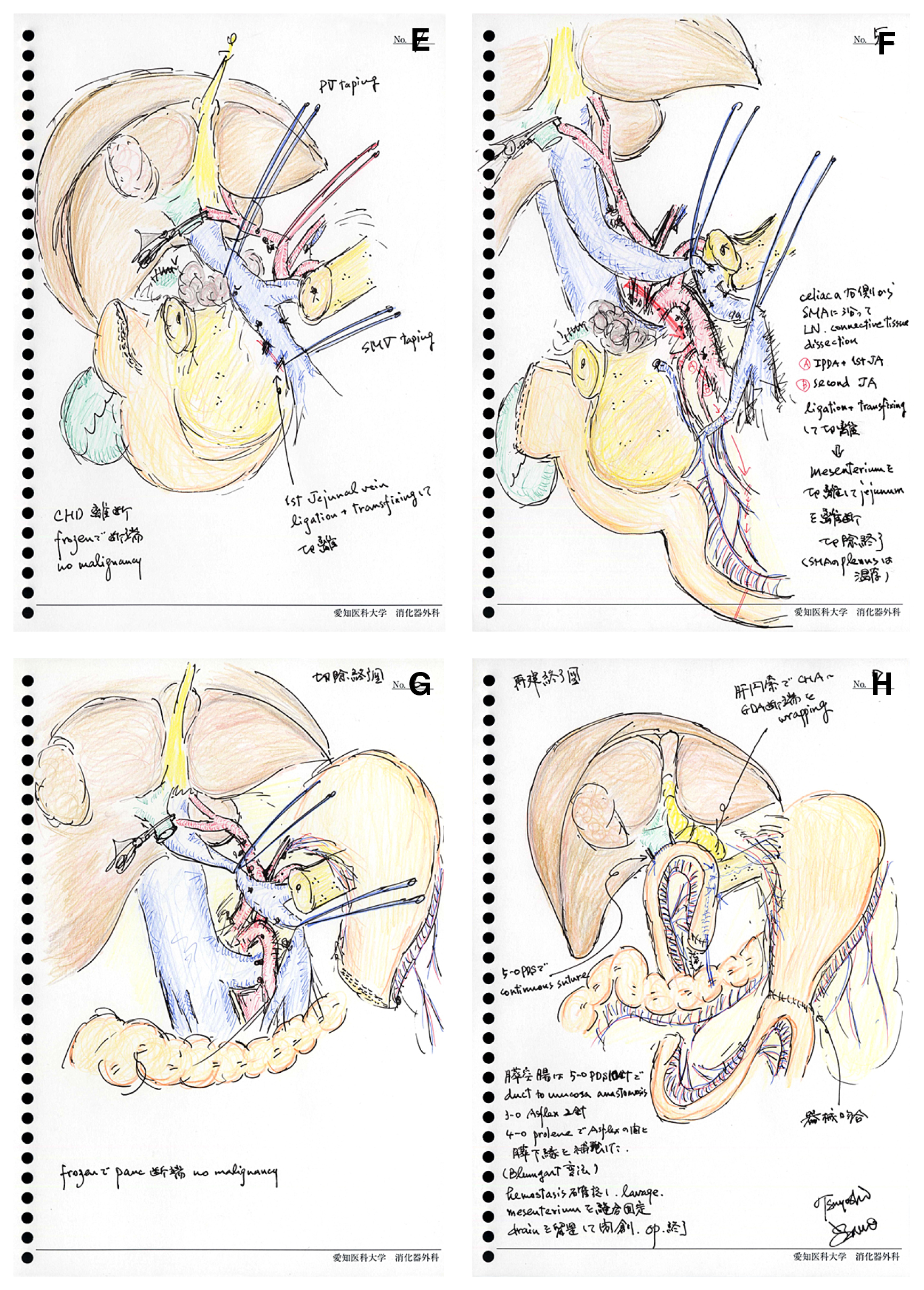 (Continued) E: The pancreatic neck and the common hepatic duct are divided, portal and superior mesenteric veins are encircled with tape. F: The lymph node and connective tissue dissection from the right side celiac axis along the superior mesenteric artery. The inferior pancreatoduodenal and the first jejunal arteries are ligated and divided. Mesenteric division is progressed and finally jejunum is transected. G: Schematic representation of operative field after pancreatoduodenectomy. H: Schematic representation after alimentary reconstruction.
