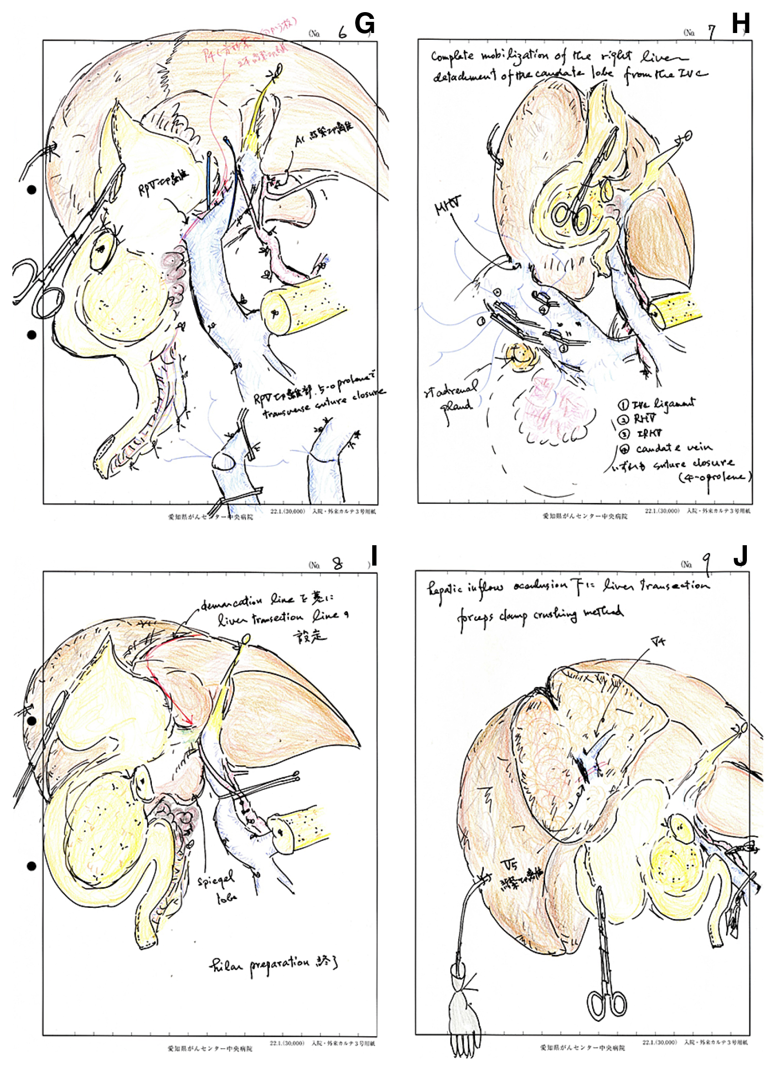 (Continued) G: The right portal vein is divided with suture closure. Skeletonization of the hepatoduodenal ligament is completed. H: The right liver is mobilized and the entire caudate lobe is detached from the inferior vena cava. Thick short hepatic veins and the right hepatic vein are transected with suture closure. I: The liver transection line is traced on the demarcation and the line on the ventral aspect of medial sector keeping from the hilar plate is critical. J: Liver transection is started under intermittent inflow occlusion using forceps clamp crushing method. The middle hepatic vein is exposed on the raw surface.