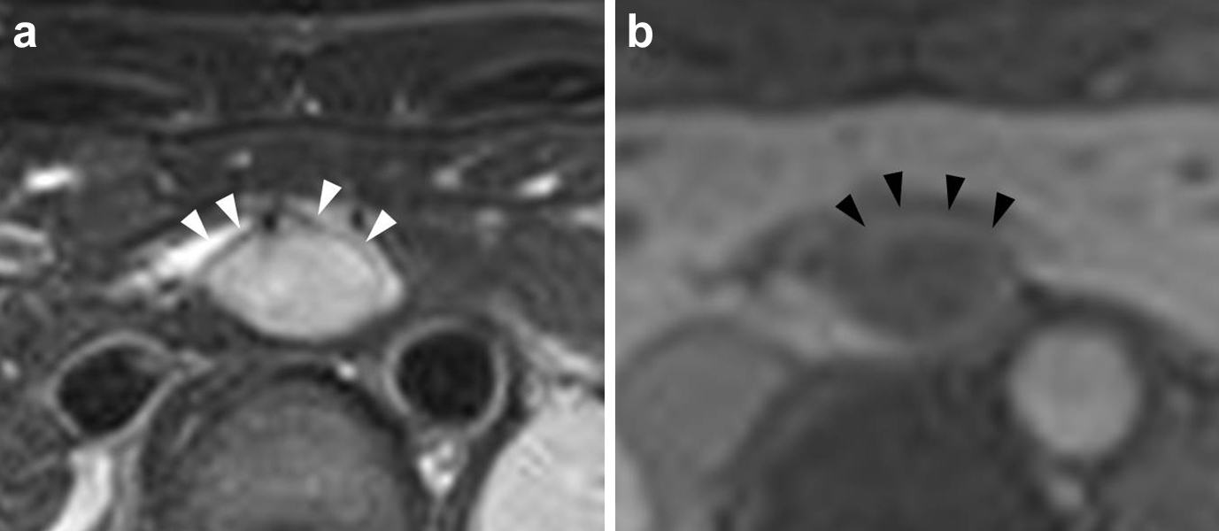 On abdominal contrast MRI, the tumor had a hyperintense signal surrounded by low intensity coating on T2-weighted images (a) and the edge of the tumor was enhanced in a dynamic study (b).