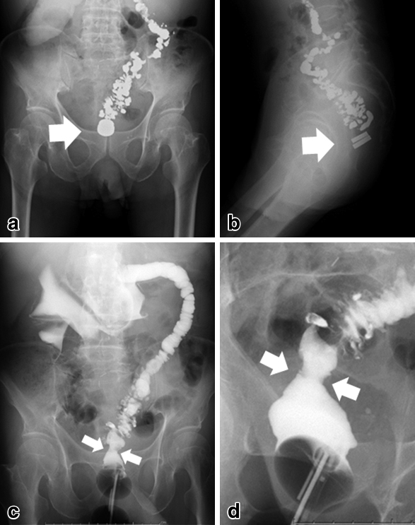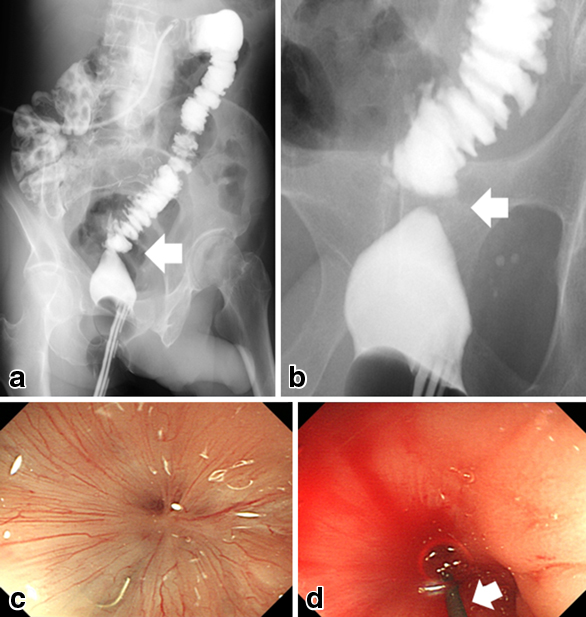Study before Yamanouchi method. a, b) Simultaneous contrast enema study from the stoma and anus showed the complete occlusion of rectal anastomosis. On transanal contrast, only the shortened rectum was contrasted. The obstruction was shown by contrasting with the transanus/stoma. The white arrows show the occlusion. c) A complete occlusion was confirmed by colonoscopy from the stoma side. d) There was also no opening from the anal side and no clearance through which the guide wire passes. The white arrow shows the guide wire (35's radial focus).
