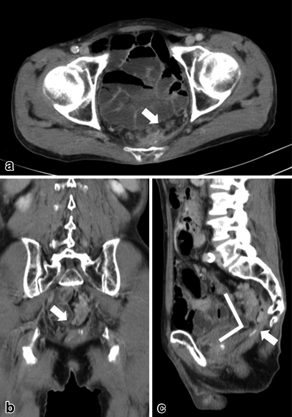 Study before Yamanouchi method. a, b) Contrast-enhanced CT showed the occlusion of rectal anastomosis (arrows). c) The occlusion area was bent like the angle.