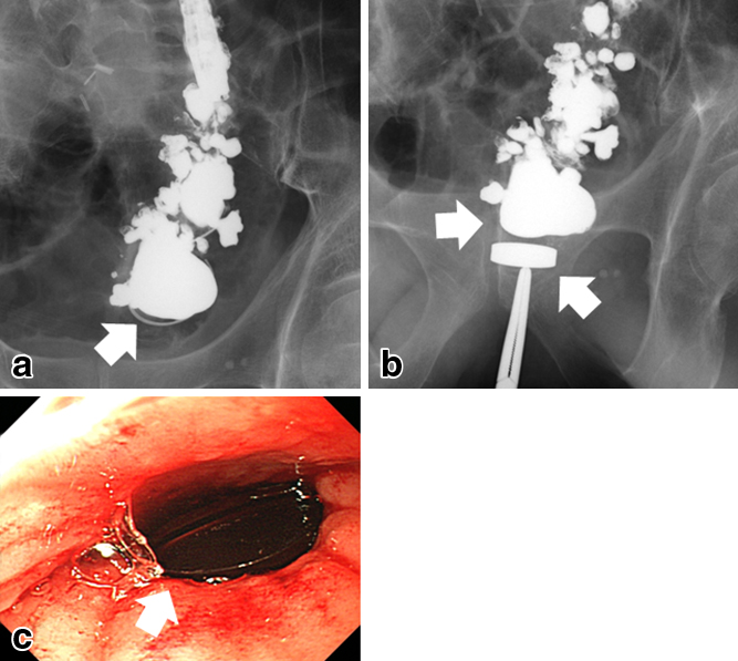 Yamanouchi method (coronal contrast/colonoscope). a) A disc-shaped magnet was inserted under colonoscopic guidance from the stoma side. The white arrow shows the guide wire. b) The other disc-shaped magnet was inserted from the anal side (diameter 17.5 mm, thickness 5 mm). The two magnets sandwiched the occlusion area. Intestinal tract. c) We confirmed that the magnet was adsorbed by the colonoscope from the anus.