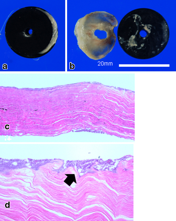 Eight days after the Yamanouchi method. a) The two magnets squeezing the occlusion area dropped out from the anus. b) The tissue of the occlusion and magnets were the same size. c) Histologically, the mucosal epithelium is completely exfoliated. Scattered foreign bodies containing bacteria is found on the surface (arrow). Strong fibrosis is observed in the stroma without vascular structure (HE c: 4× d: 20×).