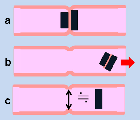 Yamanouchi method (diagram). a) Two magnets squeeze the occlusion area from both directions. b) On the eighth day after the operation, there was a dropout of the compression magnet from the anus. c) The tissue of the occlusion was discharged in the form of compression necrosis to both magnets, and the opening with the same diameter as the used magnet was obtained.