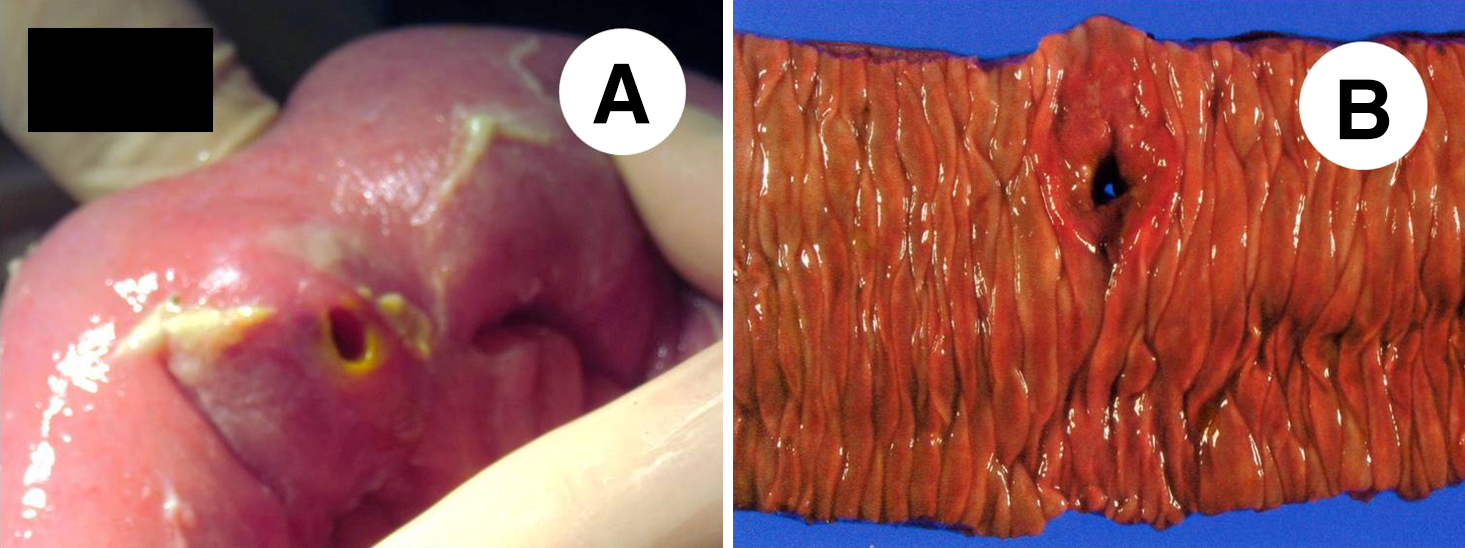 A: Laparotomy showed an 8-mm diameter of perforation which was located approximately 120 cm distant from the ligament of Treitz in the jejunum. B: The specimen showed an ulcer-like lesion surrounded with small embankment.