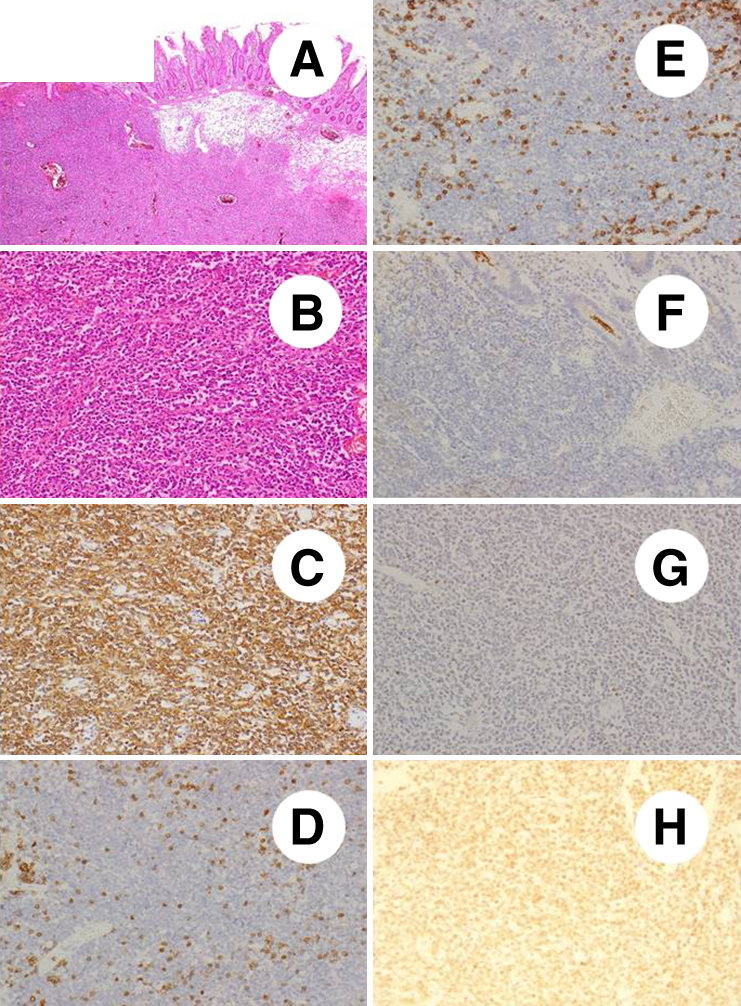 A: HE ×40, B: HE ×200, histology revealed growth of large atypical lymphocytes. C: CD20 immunohistochemistry, ×200. D: CD3 immunohistochemistry, ×200. E: CD5 immunohistochemistry, ×200. F: CD10 immunohistochemistry, ×200. G: Bcl-2 immunohistochemistry, ×200. H: EBV-encoded small RNA in situ hybridization, ×200.
