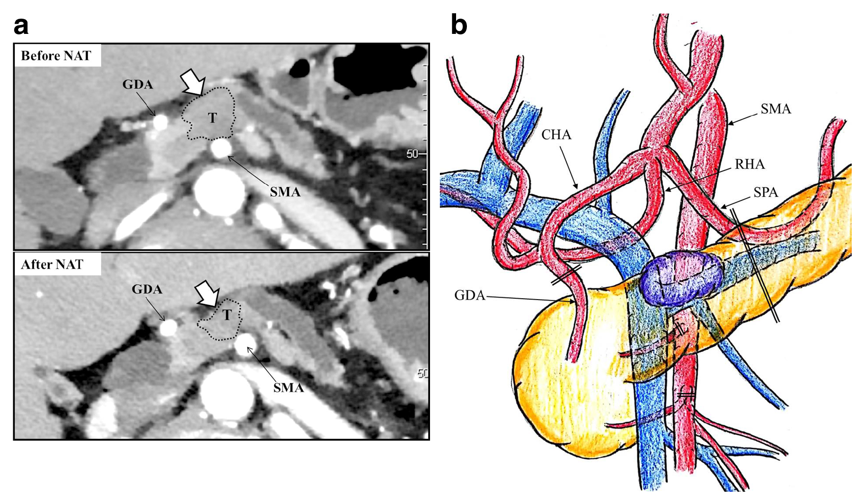 a: The tumor shrink from 21mm to 12mm after neoadjuvant chemotherapy. b: The tumor is located in the pancreatic body, extending to the pancreatic neck. NAT: neoadjuvant treatment, T: tumor, CHA: common hepatic artery, RHA: right hepatic artery, GDA: gastroduodenal artery, SMA: superior mesenteric artery, SPA: splenic artery.