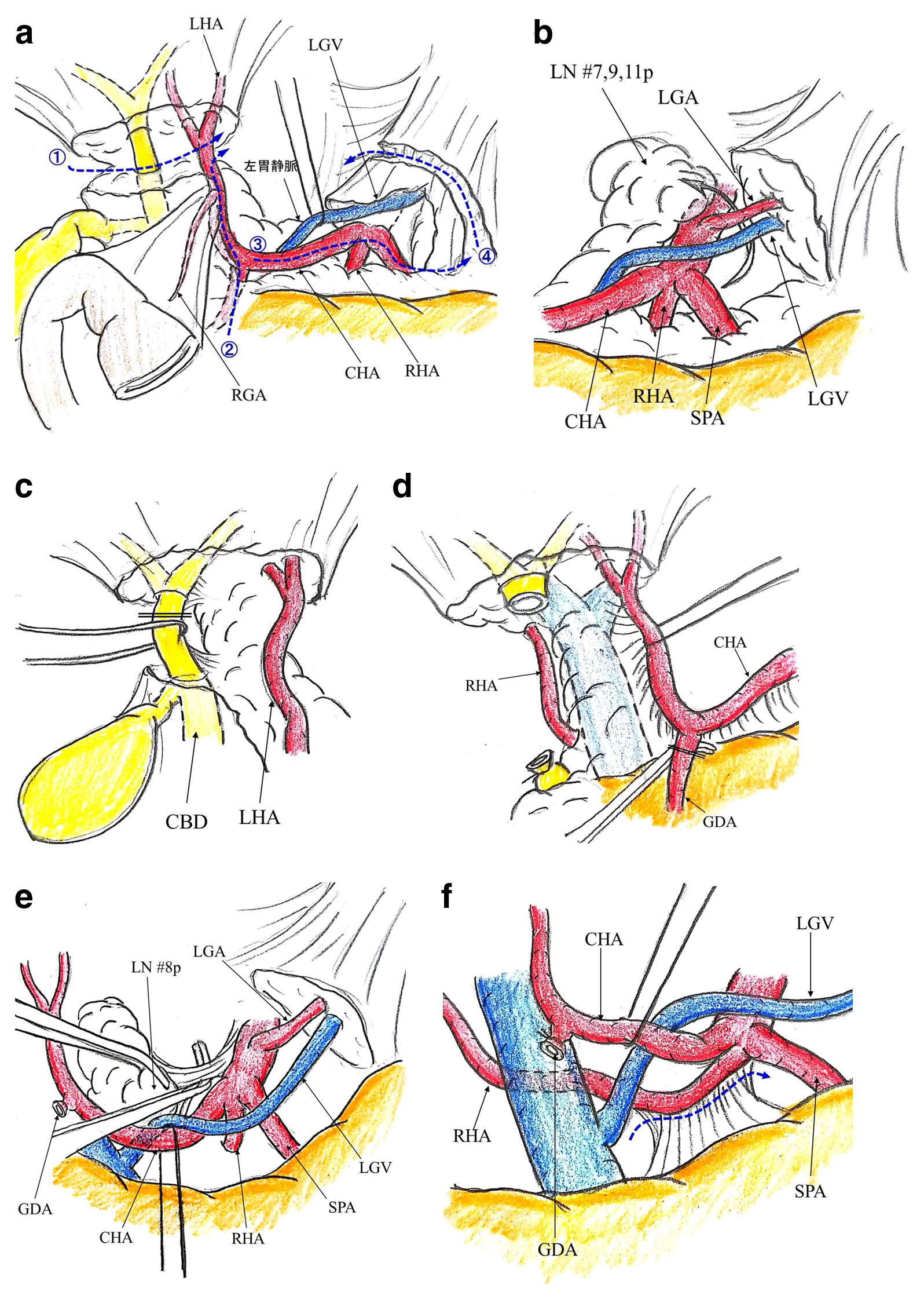 Fig. 3は肝十二指腸間膜の郭清における中間目標となる場面をイラストで順番に示している.肝十二指腸間膜の郭清では腹側から組織を観音開きにしていき,郭清したリンパ節を背側に順番に落としていくイメージで行っている.まず,左肝動脈(LHA),固有肝動脈(PHA),総肝動脈(以下,CHAと略記)の腹側を露出して,さらに本症例では併せてリンパ節#11p,7,9をen-blockに郭清した(Fig. 3a, b).剥離の方向,順番がわかるように矢印,番号をつけている.肝十二指腸間膜の郭清において,良好な視野を得るために早期に胆管を切離する(Fig. 3c).胆管を切離することで視野が展開され,温存すべき全ての動脈が確認でき,誤認することなくGDAを切離することが可能となる(Fig. 3d).GDAを切離すると肝動脈の膵臓への固定がなくなり可動性が良好となるので,それぞれにテーピングして全周性に郭清して背側に組織を落とす.CHAを牽引して視野を展開しながらリンパ節#8pを郭清して門脈の背側の組織と一塊とする(Fig. 3e).本症例では右肝動脈(以下,RHAと略記)が腹腔動脈から直接分岐していたので最後にRHAに沿って郭清した.このように切離,郭清する順番や,組織・脈管の牽引する方向などを決めてある程度定型化することで効率的に安全に郭清を行うことができる.