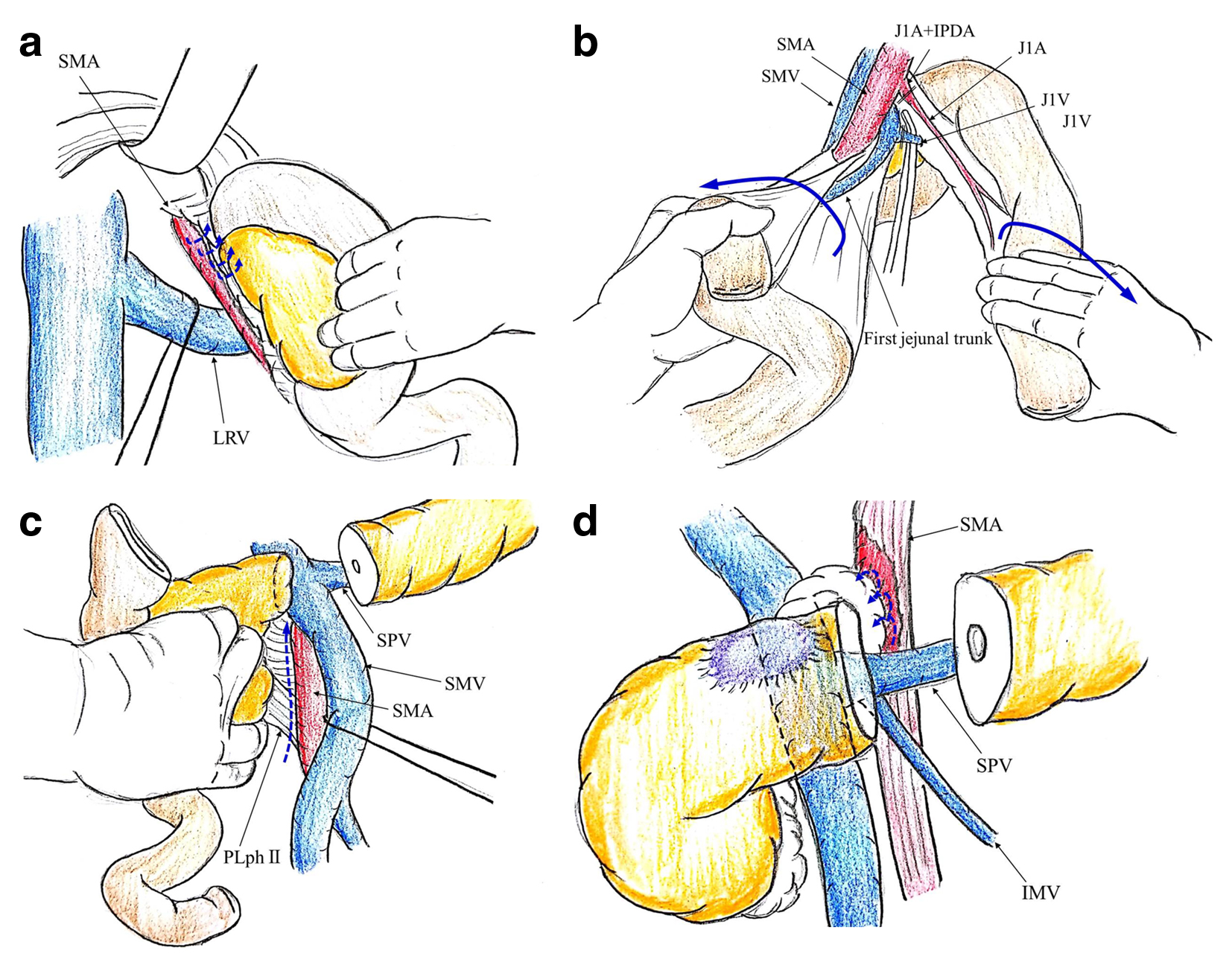 Deformation of illustration transforming a complicated shape into a more simplified shape. a: Lymph node dissection of hepatoduodenal ligament. b: left posterior approach to the superior mesenteric artery. CHA: common hepatic artery, RHA: right hepatic artery, LHA: left hepatic artery, GDA: gastroduodenal artery, PV: portal vein, BD: bile duct, SMA: superior mesenteric artery, SMV: superior mesenteric vein, IPDA: inferior pancreaticoduodenal artery, J1A: first jejunal artery.